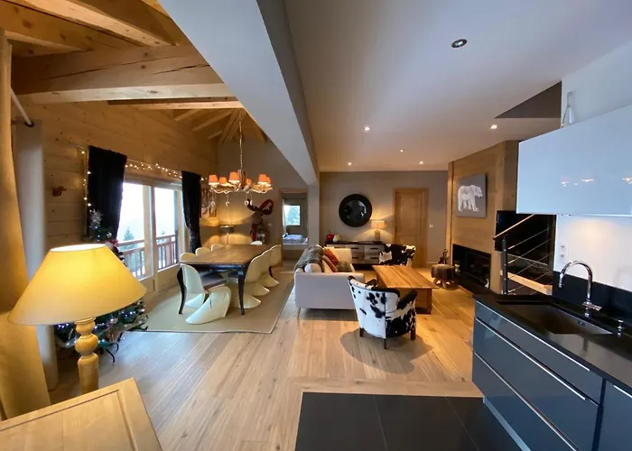 Nestled in the Courchevel 1650 district, the spacious 95 m^2 Les Craterelles Apartment features Wi-Fi and a free private car park on site. Coqs Ski Lift is 5 minutes by car from the 2-bedroom apartment, and Telecabine Chenus is 3.1 km away.